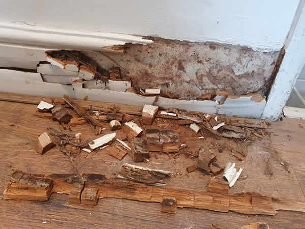 Whilst conducting an RICS Level 3 Building Survey on a Victorian-style property in Worthing, our local surveyor discovered dry rot affecting the bathroom skirting board on the ground floor.